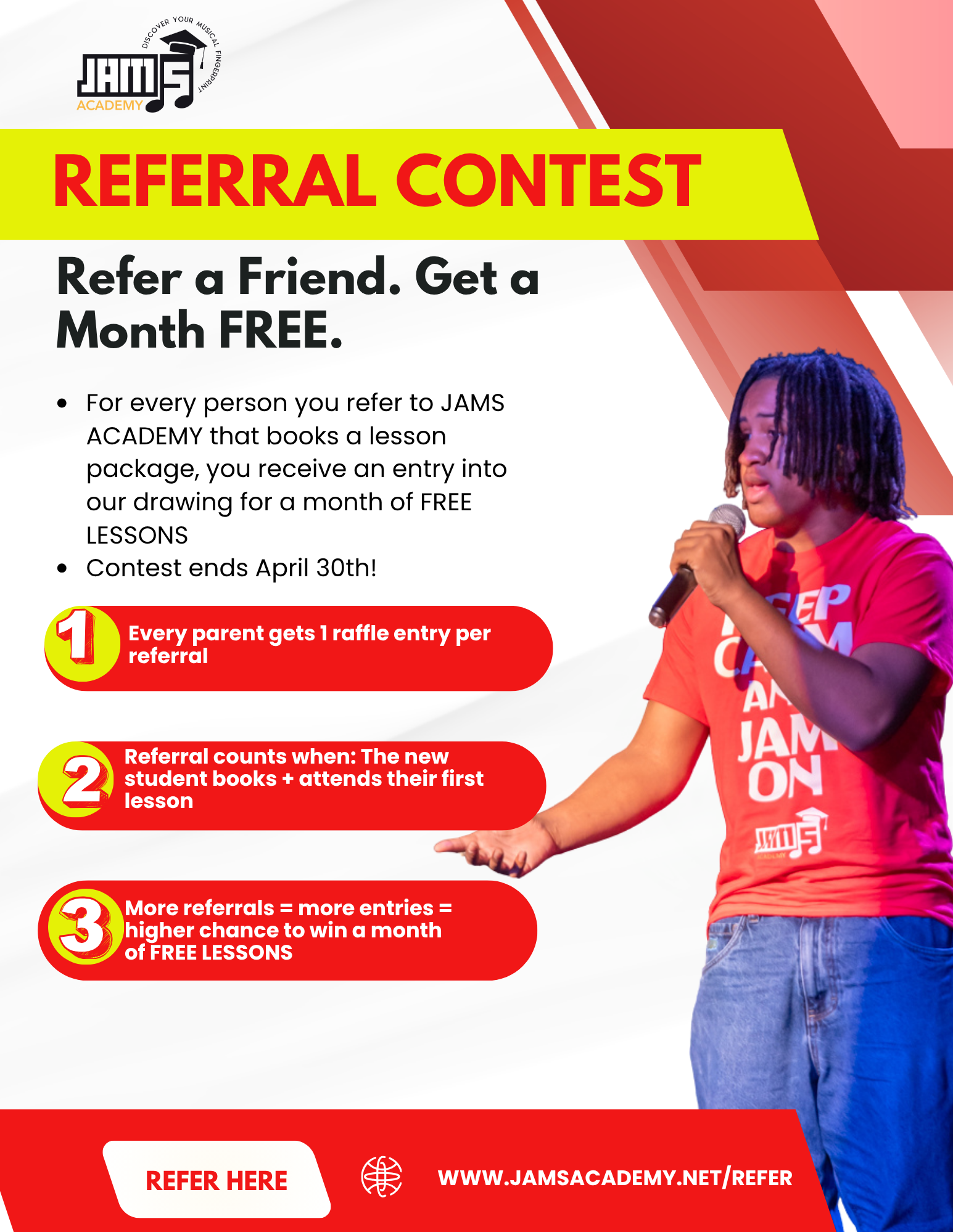 For every person you refer to JAMS ACADEMY who books a lesson package, you receive an entry into our raffle. Contest ends April 30th.